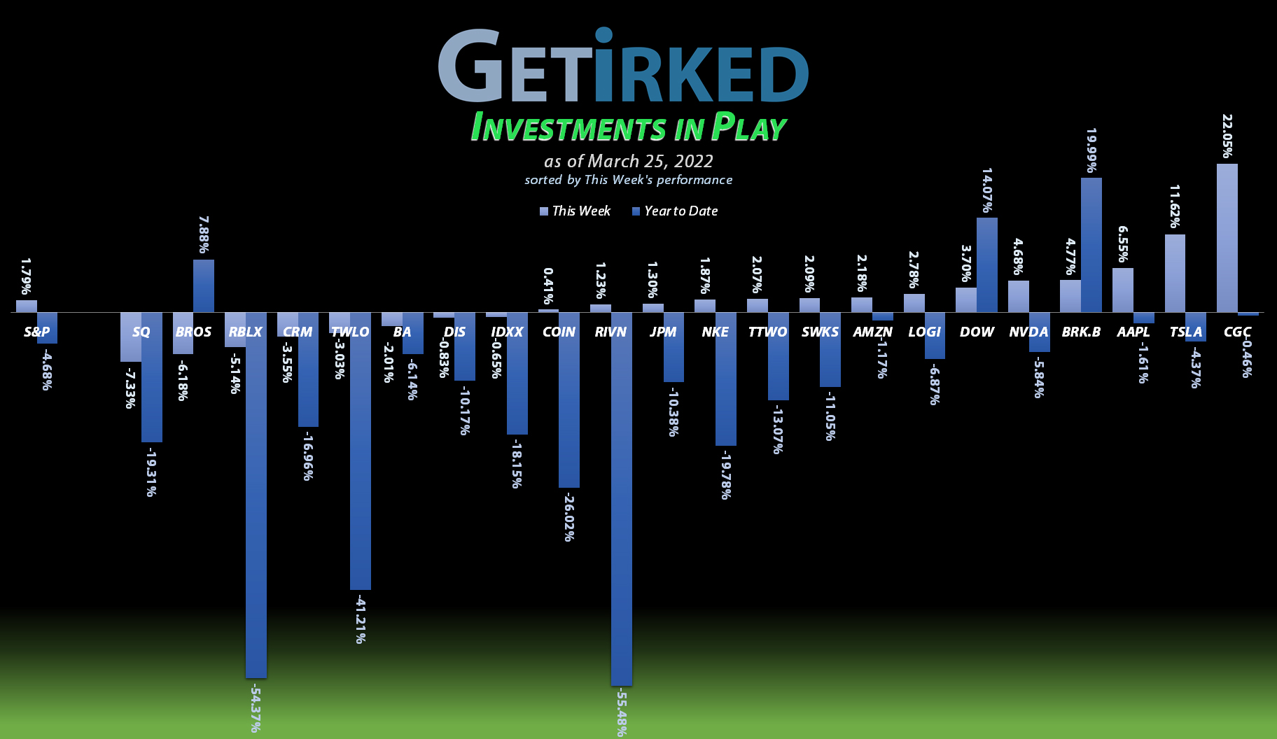 The current basket members are: Amazon (AMZN), Berkshire-Hathaway (BRK.B), Coinbase (COIN), Dutch Bros (BROS), Meta (FB), Rivian (RIVN), Roblox (RBLX), Salesforce (CRM), Skyworks Solutions (SWKS), Take Two Interactive (TTWO), and Twilio (TWLO).