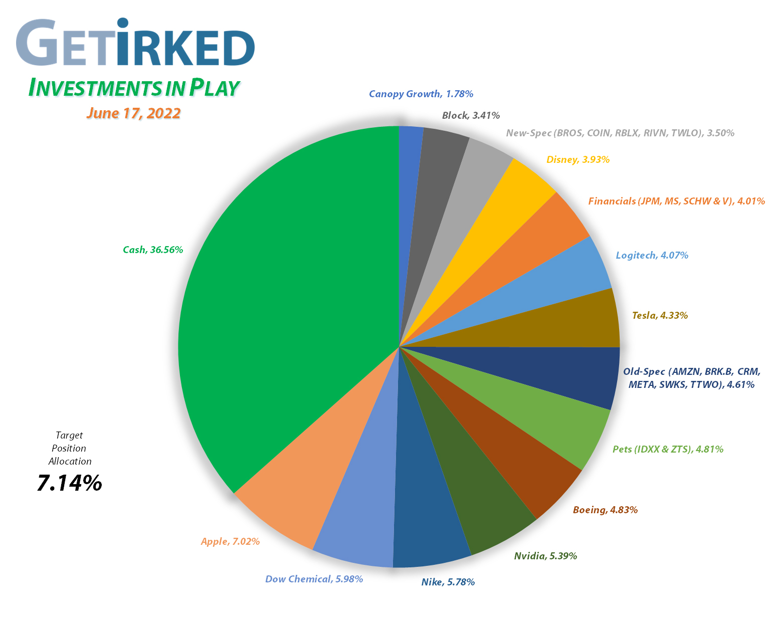 Block (SQ) continued selling off after Monday’s rout, dropping through its 2022 lows on Tuesday and triggering my next buy order which filled at $61.75. The buy locked in a -51.87% discount on shares I sold for $128.30 on July 7, 2020 and raised my per-share “cost” +$3.60 from -$75.05 to -$71.45 (a negative per-share cost indicates all capital has been taken out of the position in addition to $71.45 of profit per-share which is added to the portfolio’s bottom line).