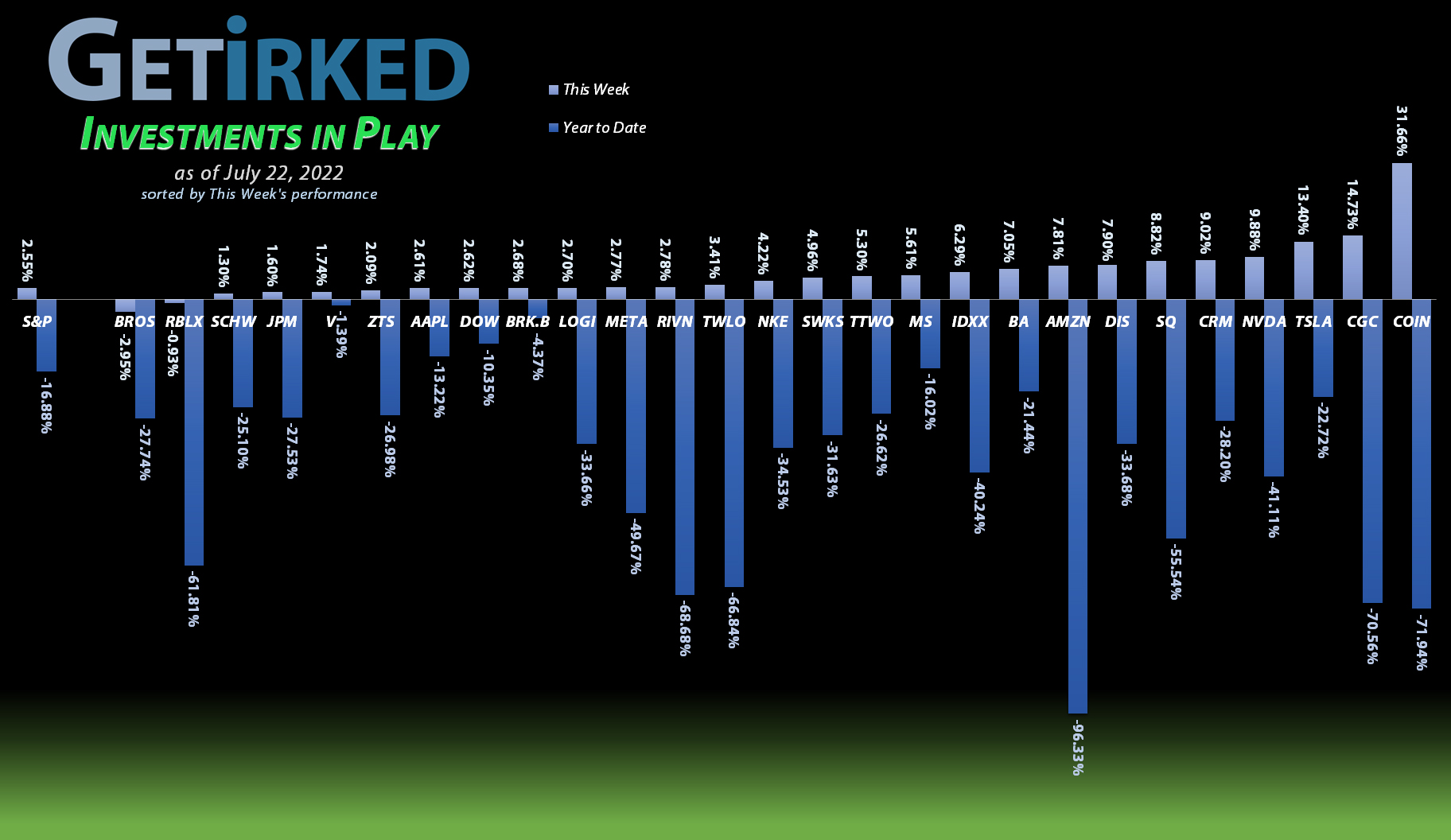 It can be truly amazing how dodging a bullet can cause such a sigh of relief that a stock will skyrocket. In this case, Coinbase (COIN) announced this week that it had no exposure to the Celsius Network or Voyager Digital, two crypto/DeFi companies that completely screwed the pooch and declared bankruptcy in the past few weeks. As a result, investors piled into COIN, causing it to, well, mint coins and surge +31.66%, earning itself the spot of the Week’s Biggest Winner.