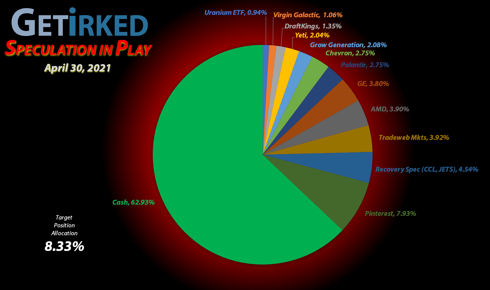 Currently, my Recovery Spec stocks are as follows: the Airlines Exchange Traded Fund (JETS) and Carnival Cruise Lines (CCL). They are listed as a single allocation in the portfolio breakdown chart each week.