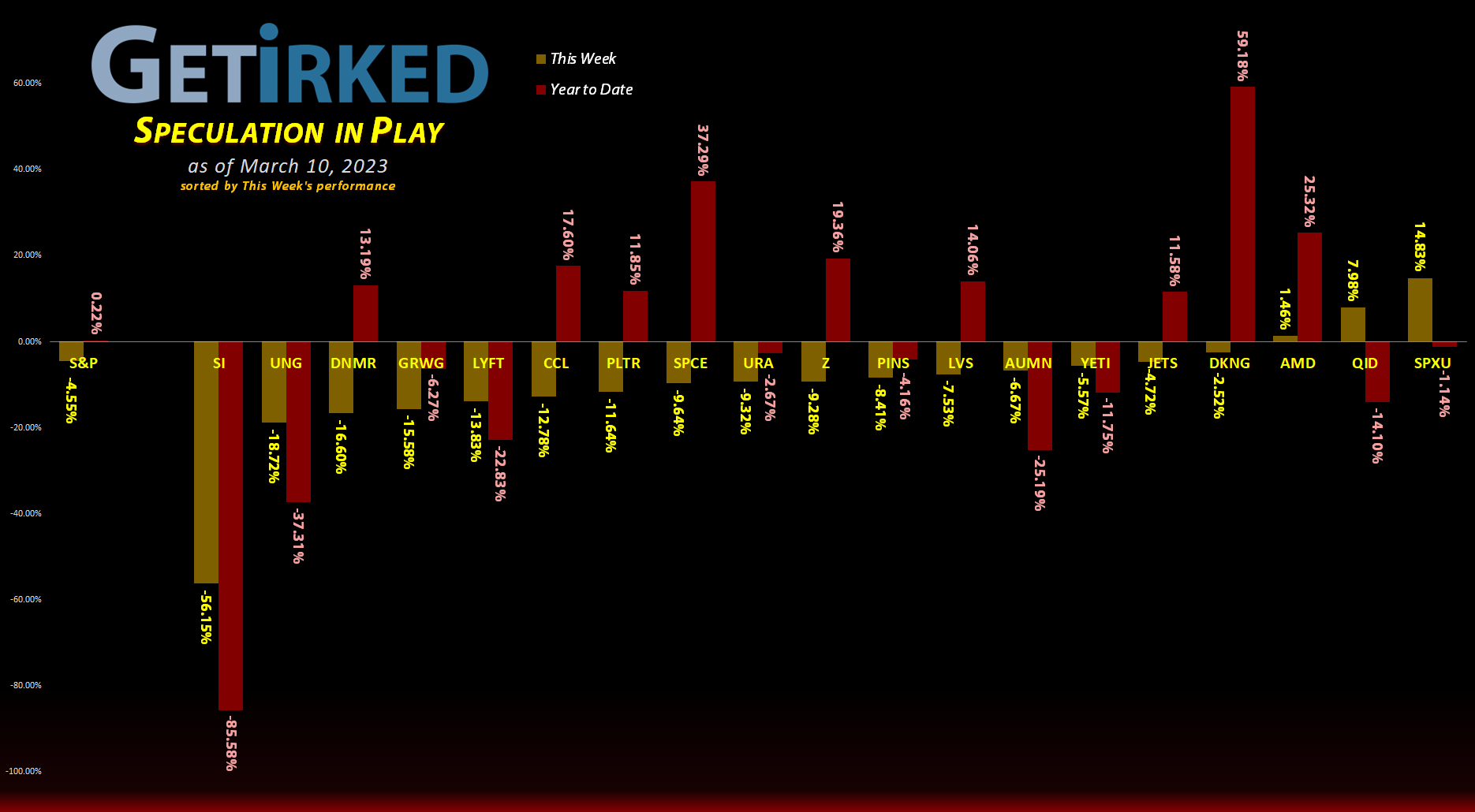 Surprisingly, unlike its fellow bankrupt bank, Silicon Valley Bank (SIVB) this week, Silvergate was not halted and zeroed out by the FDIC so it kept trading. SI closed the week down a whopping -56.15% and I don’t think it’ll stop until it hits zero…