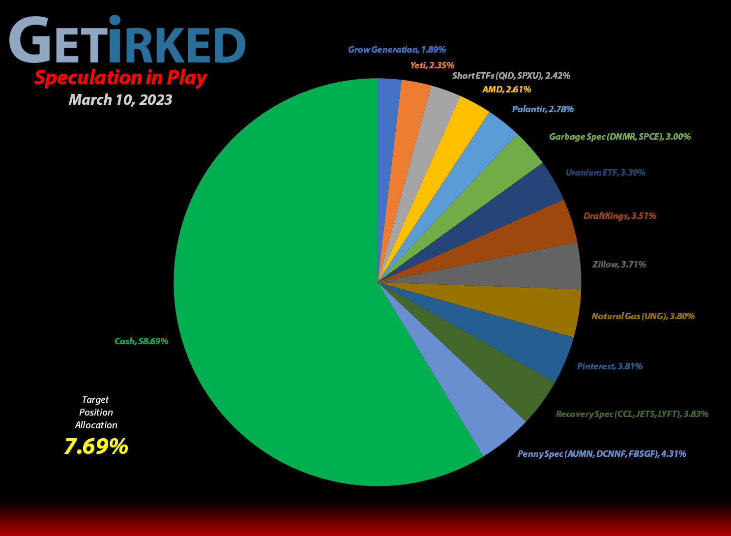 As a result of the above housekeeping, I have increased my target position allocation to 7.69% as there are now only 13 allocation positions (thanks to the addition of this week’s Short ETFs basket and throwing Lyft in with the Recovery Spec) rather than the 15 positions I had last week.