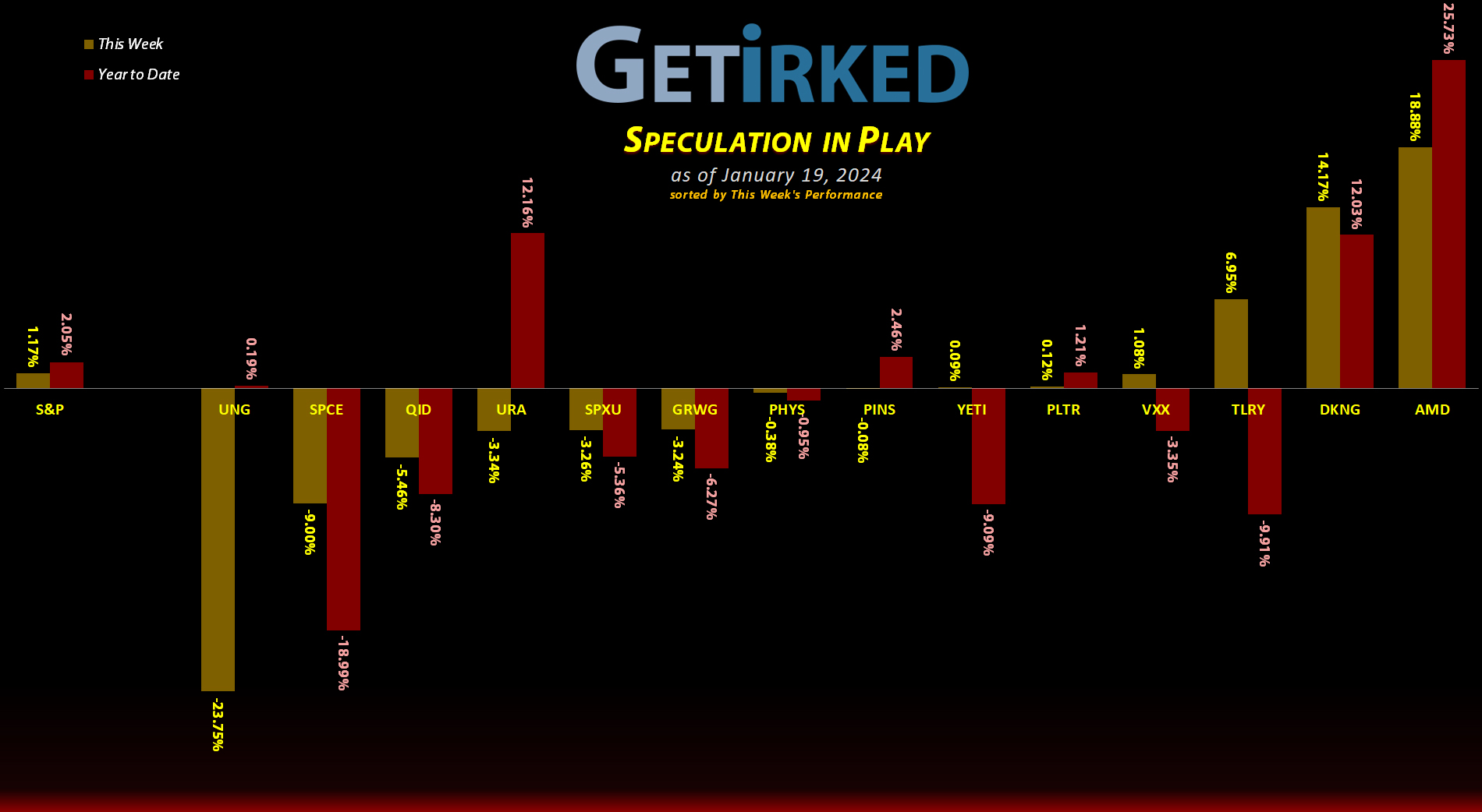 Advanced Micro Devices (AMD) exploded to the upside after hinting at huge sales numbers thanks to its graphics units targeting artificial intelligence. AMD popped a pretty incredible +18.88% to land in as the Week’s Biggest Winner.