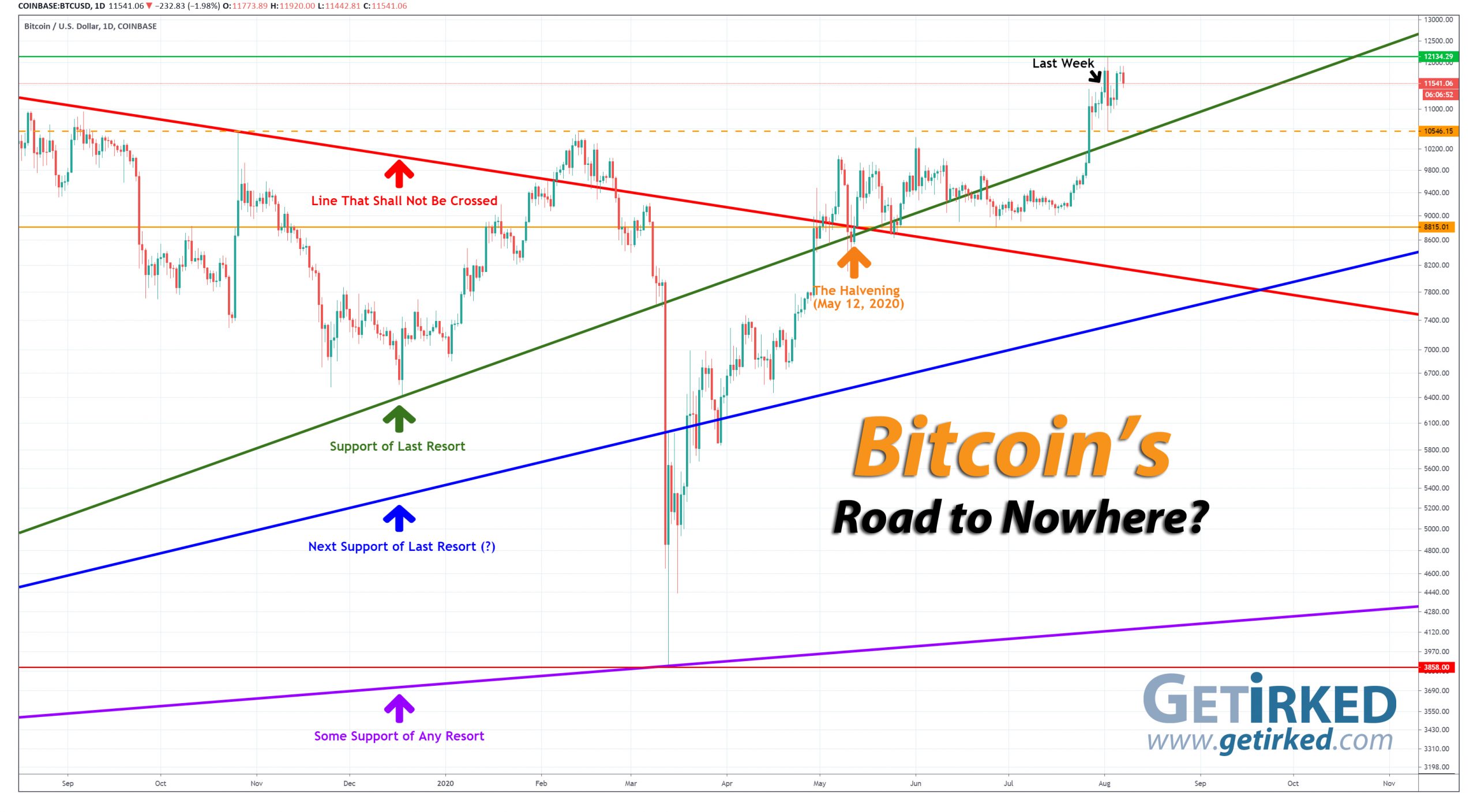 Bitcoin pulled back -13% last Saturday (8/1/2020) before finding support at $10,546.15, its new weekly low, after dropping through the $12,000 mark earlier in the day.