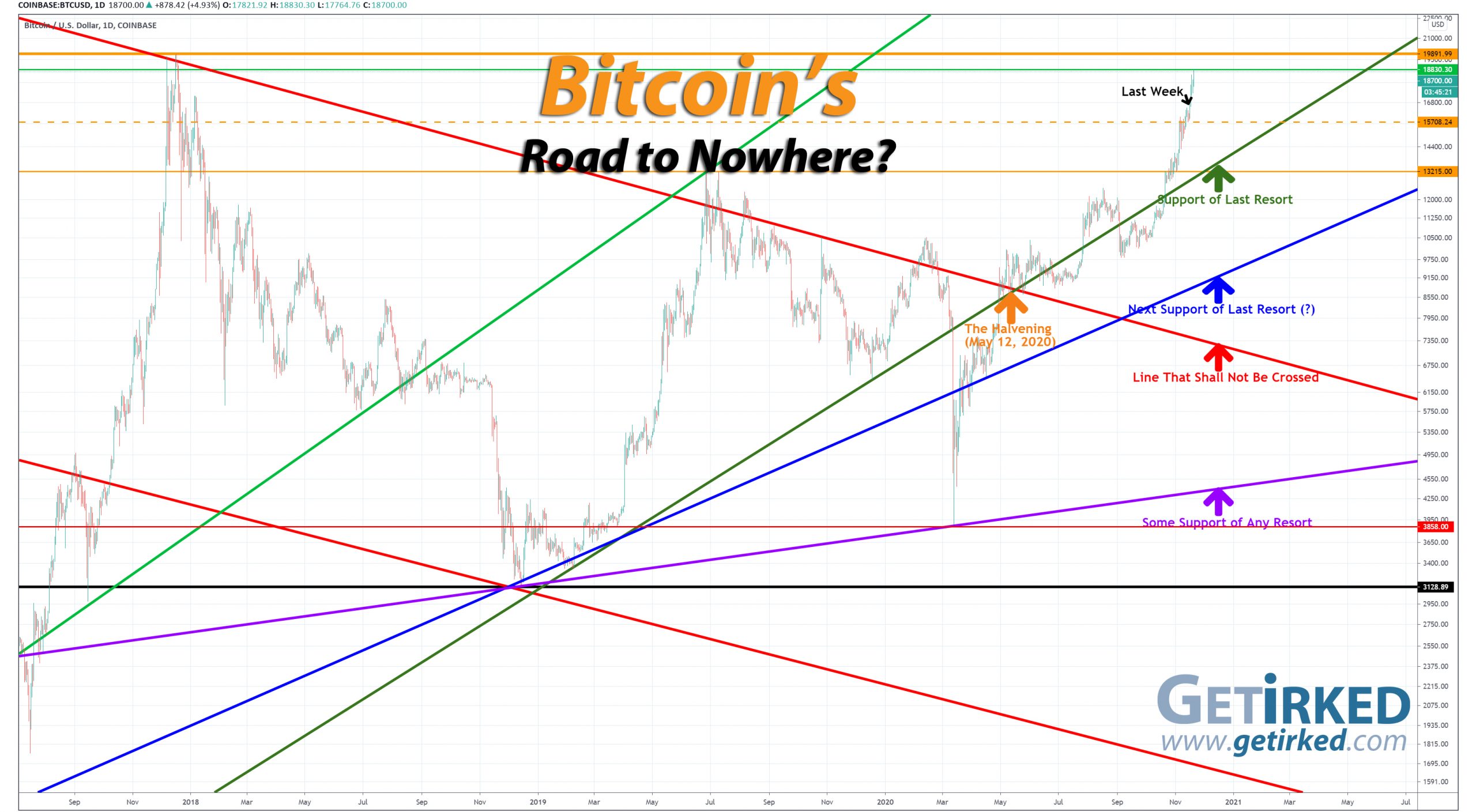 For this week’s chart, I pulled the timeline way back to a Daily chart all the way to Bitcoin’s All-Time-High in November 2017 of $19,891.99 (shown as the large solid dark orange line) just so viewers can see how remarkable this year’s bull run is. However, the parabolic move in this chart definitely cannot be argued… that’s a lot of up momentum with almost no retracement at all.