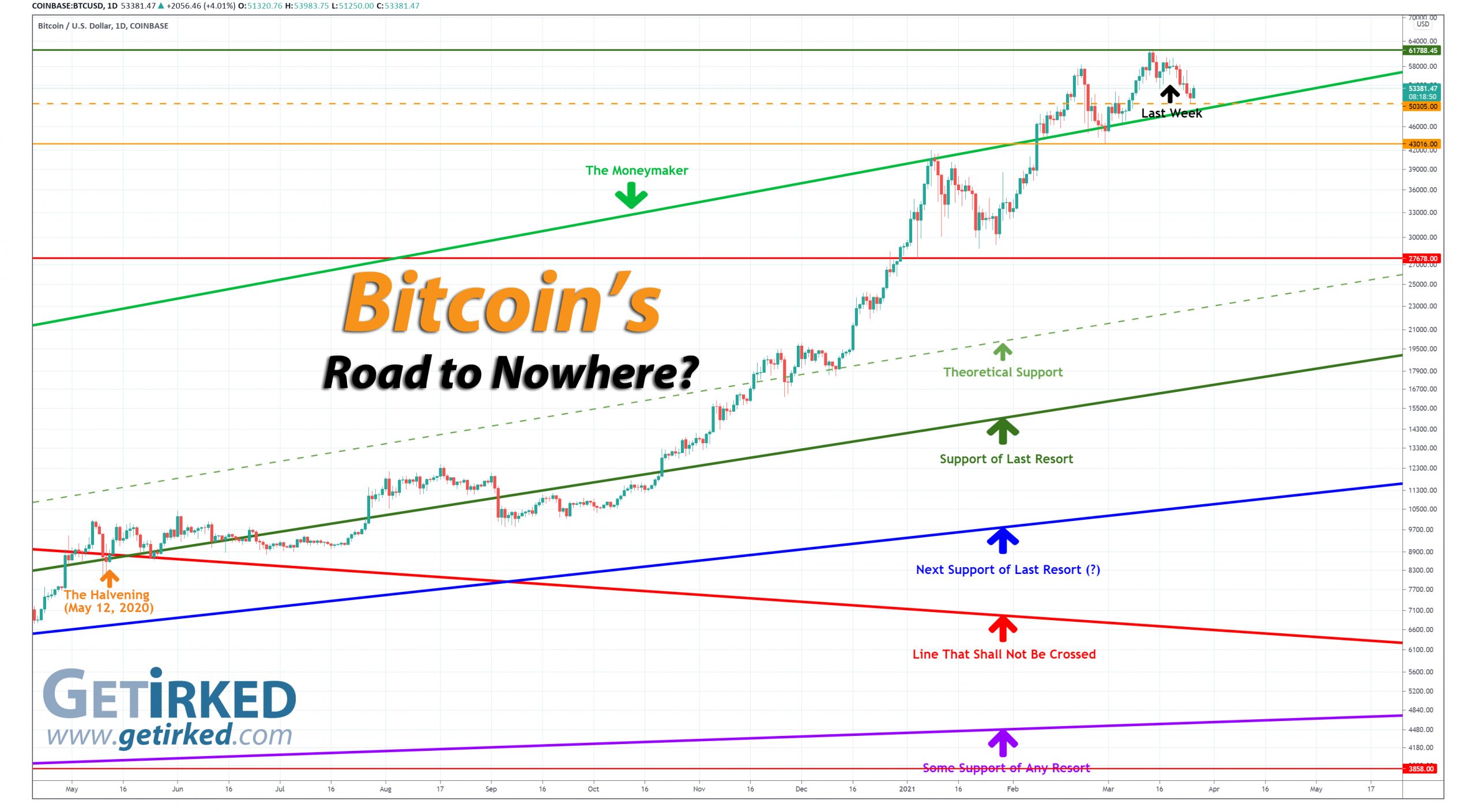 Bitcoin sold off after last week’s update, dropping to a low of $50,305.00 (-18.59% off its all-time high) before finding support and bouncing as of this writing.