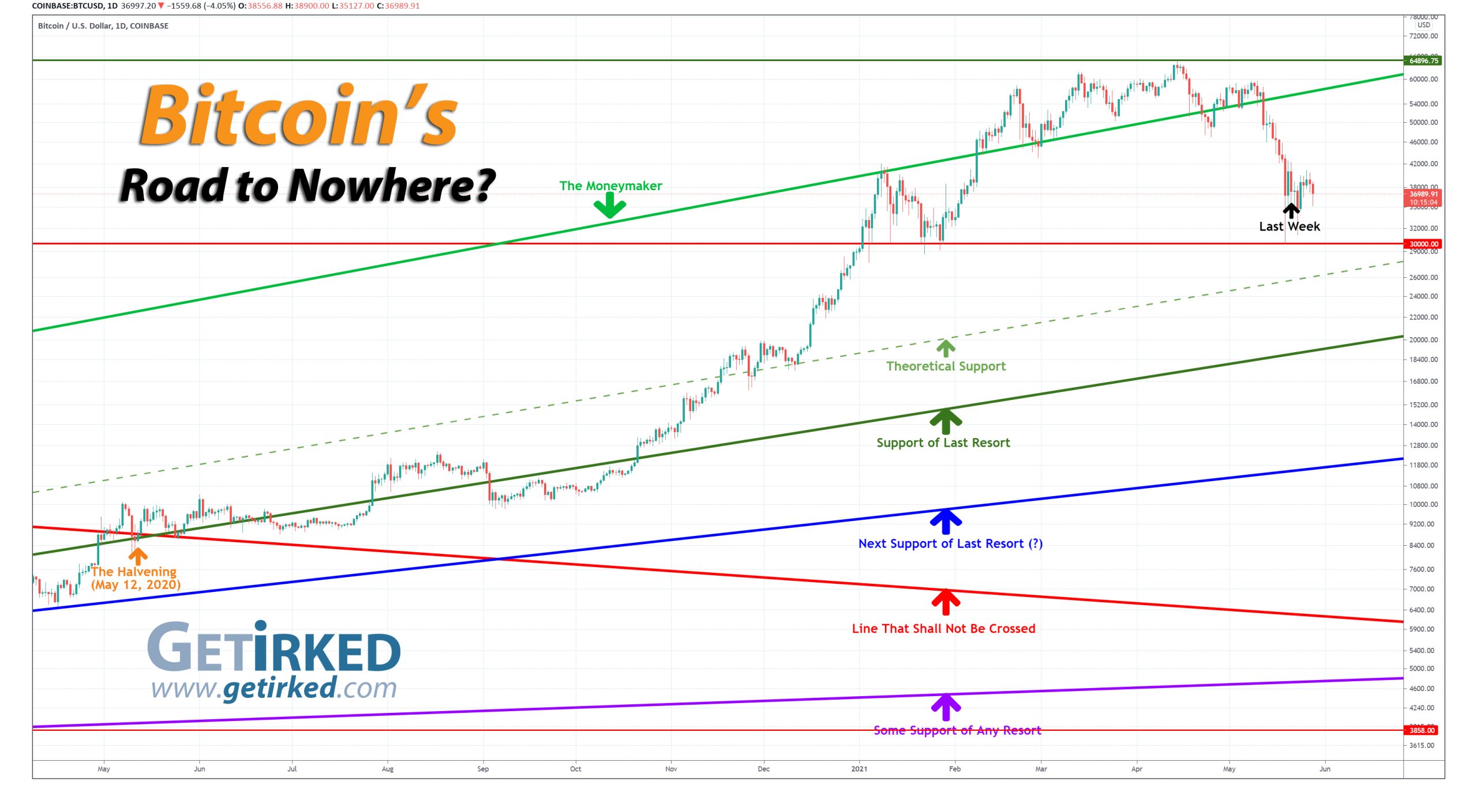 As a reminder, the drop from 2017’s high to 2018’s low was -84.36%. An identical drop from the current 2021 high of $64,900 gives us a downside target of $10,150.36, more than -70% lower than my current per-coin cost.