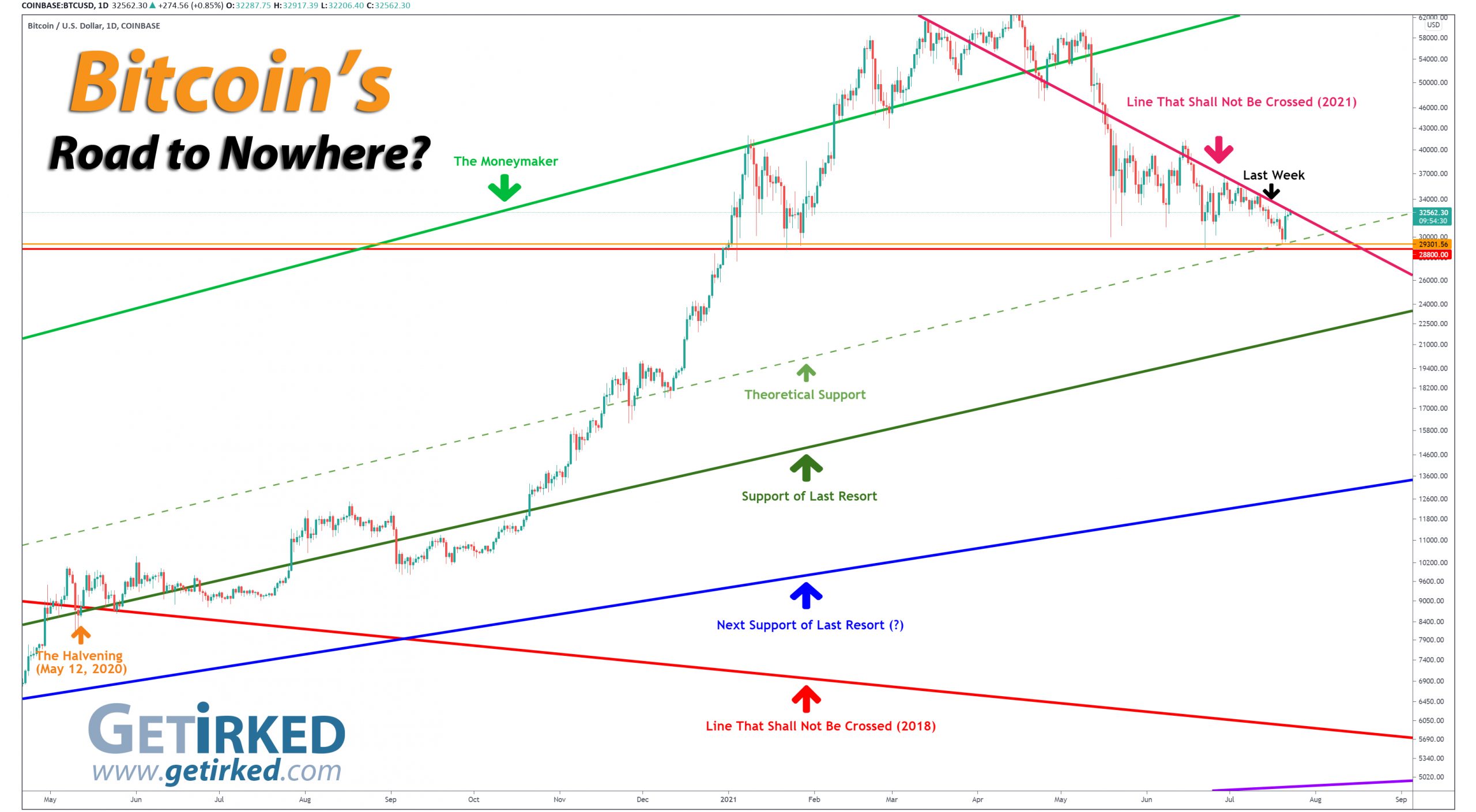 Bitcoin once again broke below $30,000, finding support at $29,301.56 late Tuesday before bouncing on Wednesday where it now tests The Line That Shall Not Be Crossed (2021). If Bitcoin can not break through and turn the trendline into support from resistance, it will remain in the overall bearish downward macro pattern.